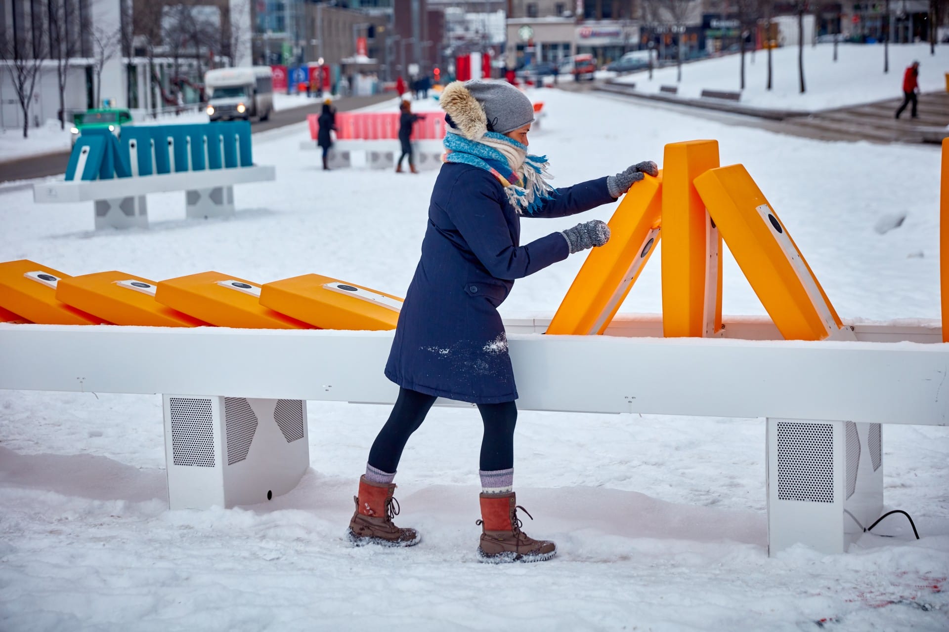 « Nearly all of us of have had the pleasure of toppling over a long line of dominos! We decided to use that simple, fun and universal pastime to bring passers-by together and foster a spirit of cooperation. We hope that participants will join forces to set the dominos back up and explore the different soundscapes the dominos create whenever they are handled or knocked over. For effet domino, we wanted to use bright tropical colours and fun, flashy patterns and sounds to give the installation and video a really playful feel and help people forget the winter gloom. »
