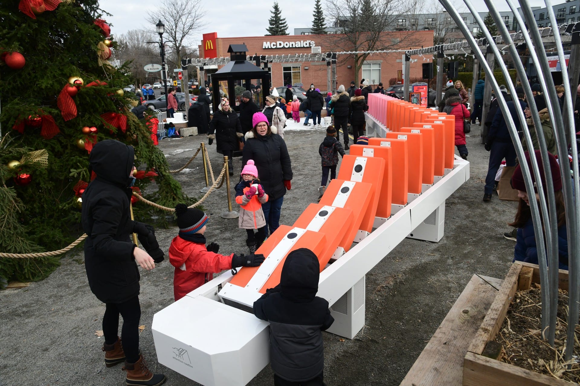 More than a game, Domino Effect is a sensory installation that celebrates movement, colour and sound. With its vintage tropical palette and large-scale elements, it turns a simple gesture into a moment of shared fun: a bright, feel-good break from winter gloom.