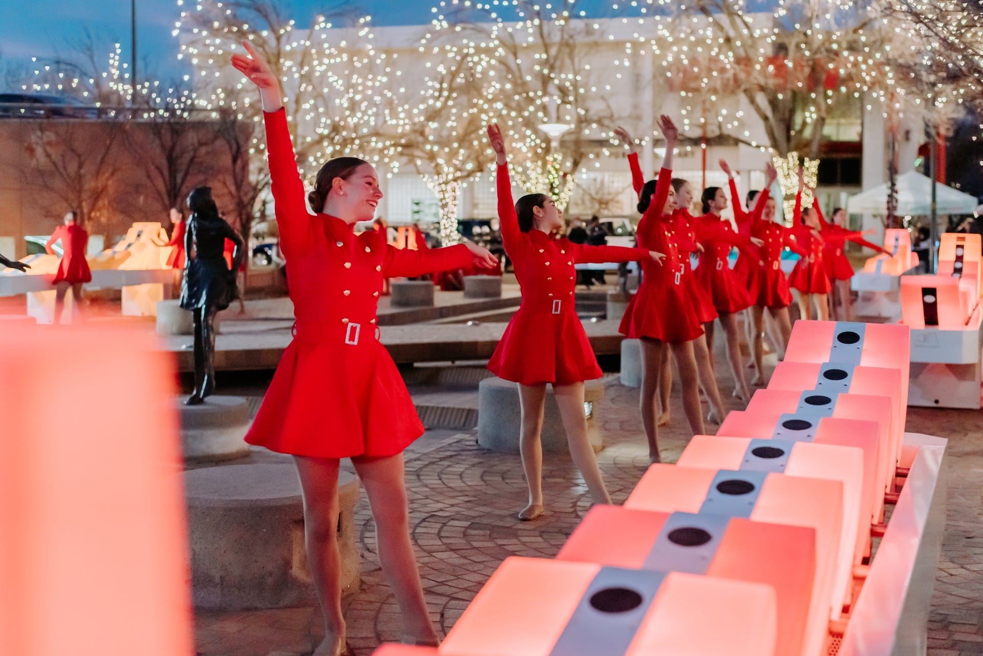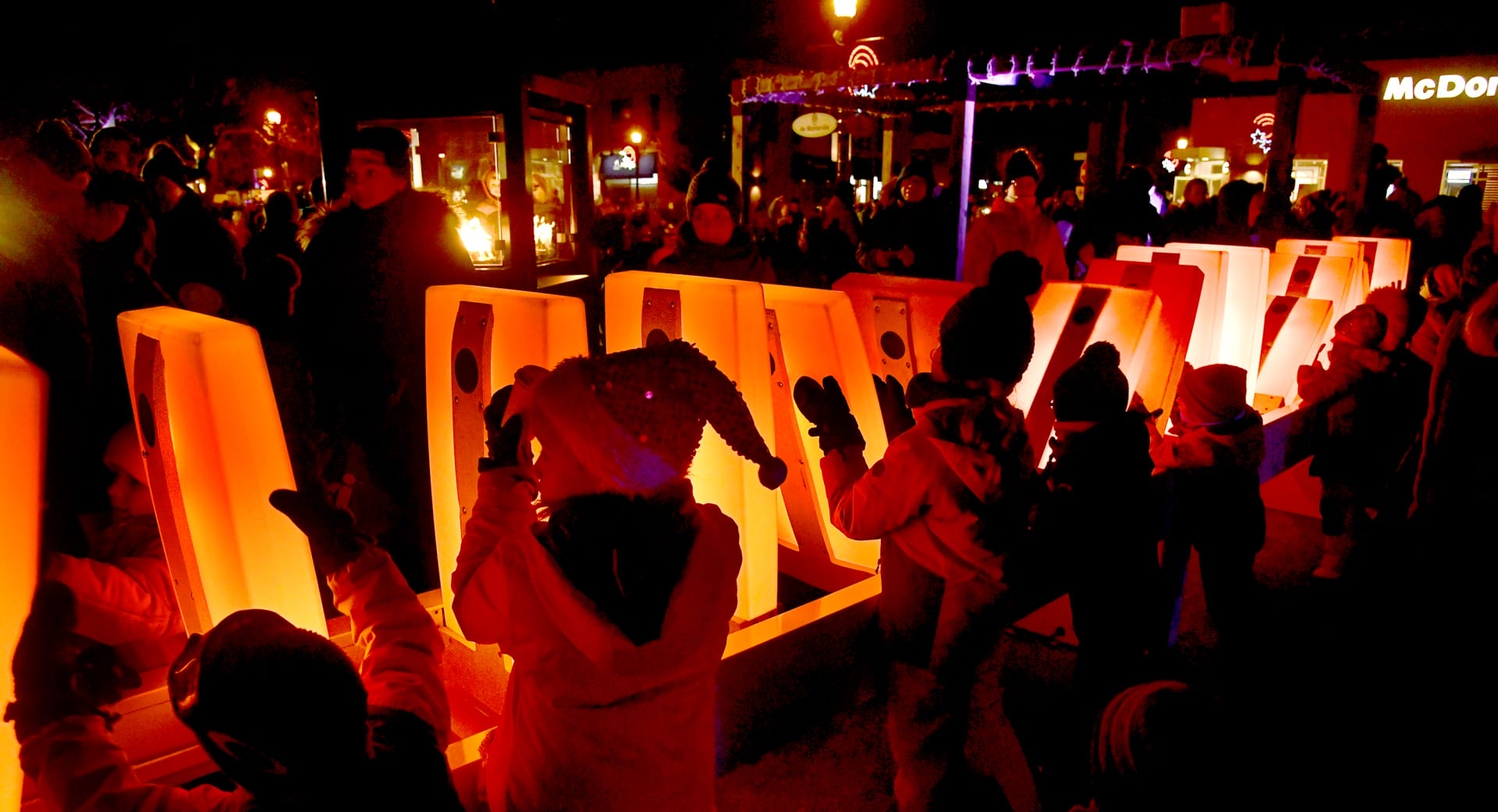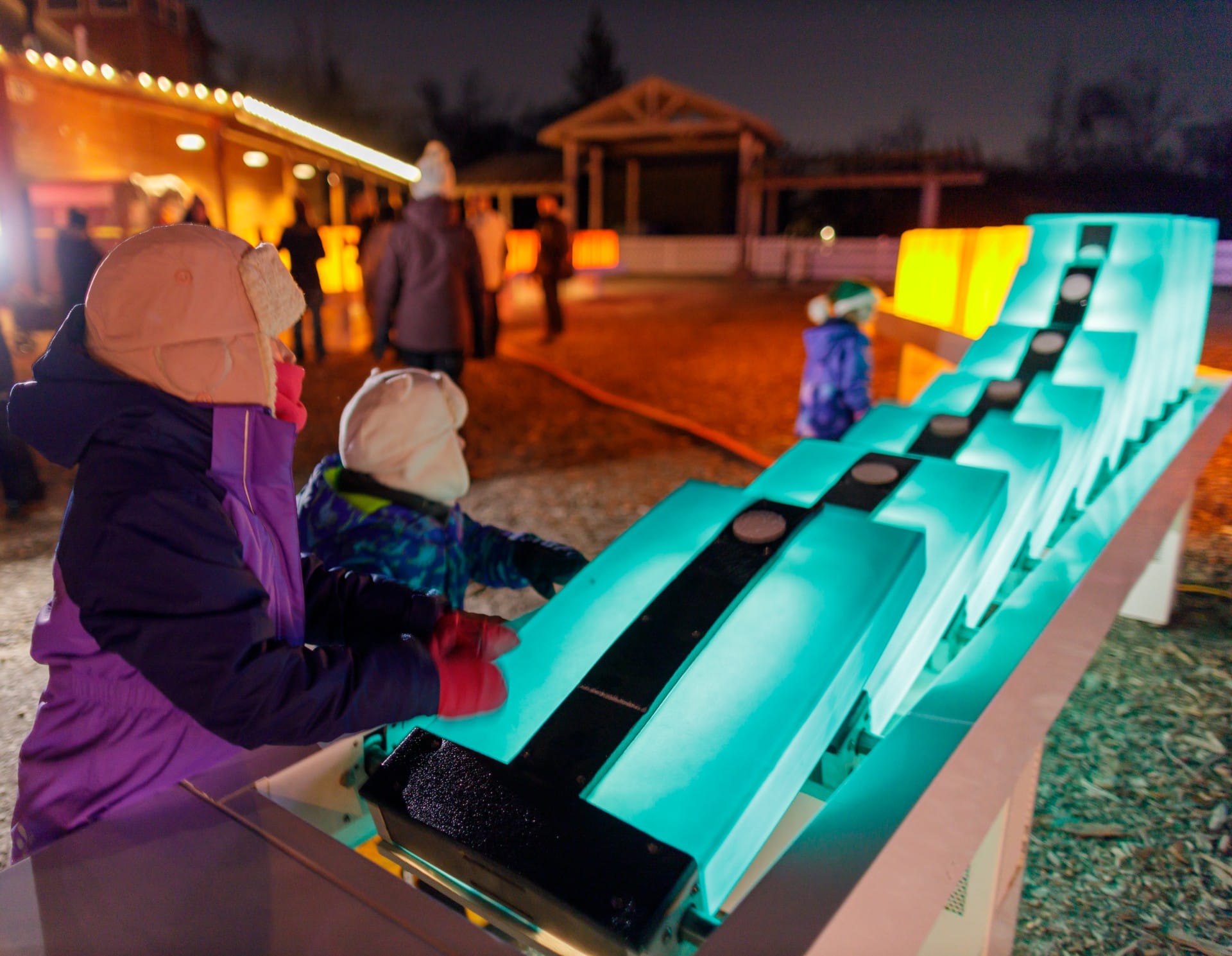 Domino Effect invites the public to step into a playful environment filled with oversized luminous dominos spread across several stations. Each station emits a distinct musical atmosphere, creating a gentle soundscape that accompanies the experience.